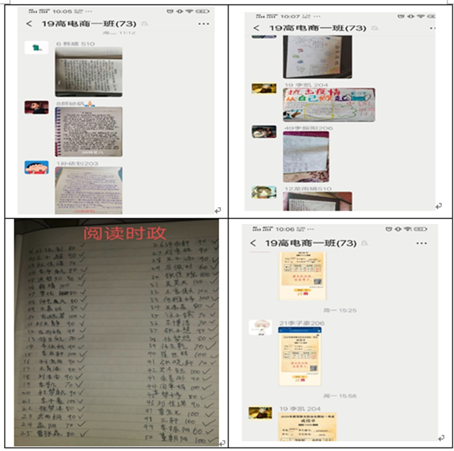 为了更好地监督早操、课间操、时政阅读、班会及专业课情况,宋老师采取了专人负责制,每个科目都有一个具体的负责人,学生每天上课的打卡情况、作业情况都需要截屏传给相应负责人,各科负责人负责监督和统计工作,并于每周进行一次汇总。