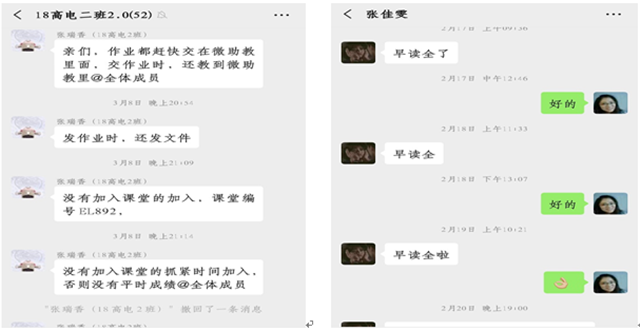 网络教学对学生来说是一种新鲜事物,网络班级管理对班主任同样如此。杨志伟老师是18高电二班的班主任,在近三周的网络班级管理过程中,感触颇深。从刚开始的手足无措到现在的得心应手,这是一种成长,也是一种进步。她的管理主要从以下几个方面着手: