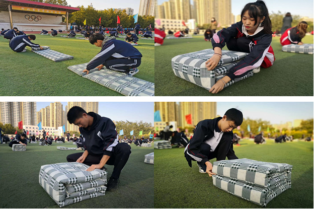 10月12日下午4点,我系在操场举办了叠被子比赛,18个班级共180名同学参赛。本次比赛邀请了校党委副书记何泽水,教务处副处长李庆祥、骆立华,基础部副主任马巍巍,学生处卢倩、张银燕、宋俊平,财会系刘娜娜,经管系刘宇栋,外事系刘伟六位老师担任评委,禄小颖副主任主持。