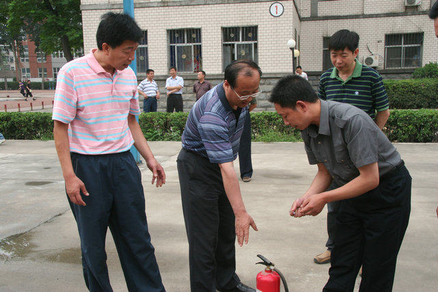 校长杨淑敏(左二)和党委副书记何泽水(左四)听取乔教官关于灭火器使用的介绍