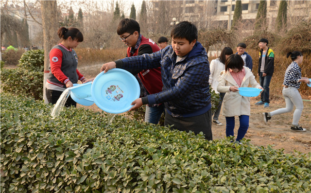 下午放学后,参加活动的青年志愿者们纷纷走出教室来到校园的各个角落。他们有的给树木花草浇水;有的捡拾散落在树丛中的白色垃圾;有的清理花坛中的杂草落叶,一个个忙的不亦乐乎。 经过一个多小时的劳动,校园中大部分树木都浇上了水,绿花带中的白色垃圾也被捡拾一净。参加劳动的青年志愿者们,他们的衣服上鞋上虽然沾满泥土,甚至有的同学手被树枝划伤,但是他们没有叫苦叫累。他们纷纷表示:植树节虽不能亲自到山区或林场种下一棵树,在校园中亲手为花草树木浇上一次水,也是在植树节为环保做出的一份贡献.