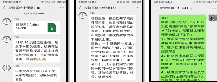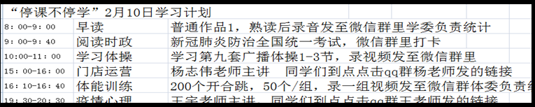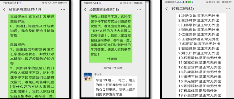 为保障线上教学有序开展,迅速重新建立了微信交流平台,用于每天上报体温及班主任所下达的任务,原班级QQ群是为了保障任课老师与学生交流及下达任务而使用,确保任课老师在授课过程中,能及时与同学们交流,为同学们解答疑惑,准备工作完毕后,她结合本班课表为班级同学制定了一日计划,教育学生要热爱科学,尊重生命、敬畏自然,养成良好卫生习惯,调整好身心状态,有效地进行自我管理,安排好生活、锻炼和学习。