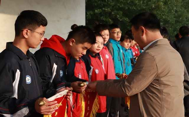 在10月7日升旗仪式上,马巍巍副主任对早读情况进行了通报,对于各班同学都能够按时有序进行早读提出表扬,也对检查早读情况的老师和同学的辛勤付出给予充分肯定。校党委副书记何泽水、学生处长郭利杰、基础部副主任马巍巍为获奖班级授予“早读优秀班级”流动红旗。
