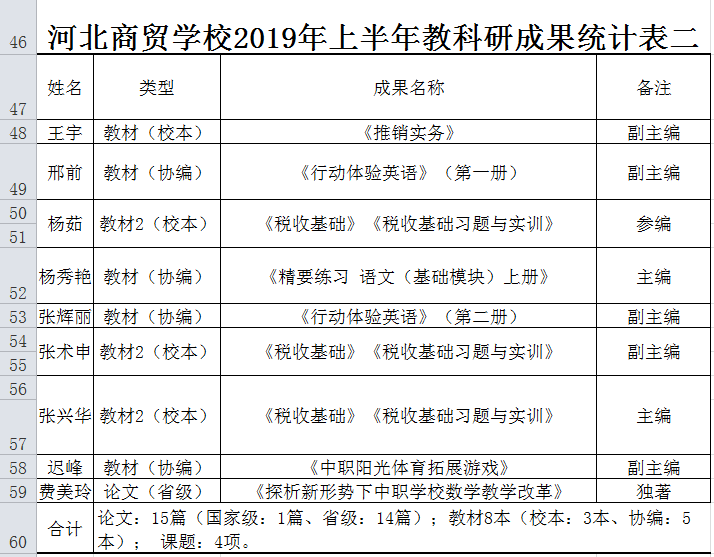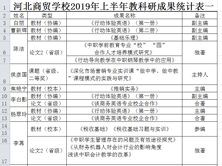 近日,我校完成了2019年上半年教师教科研成果的统计工作。教师们主要从教材、论文、课题这三个方面来进行教科研活动,展示自身教科研能力。