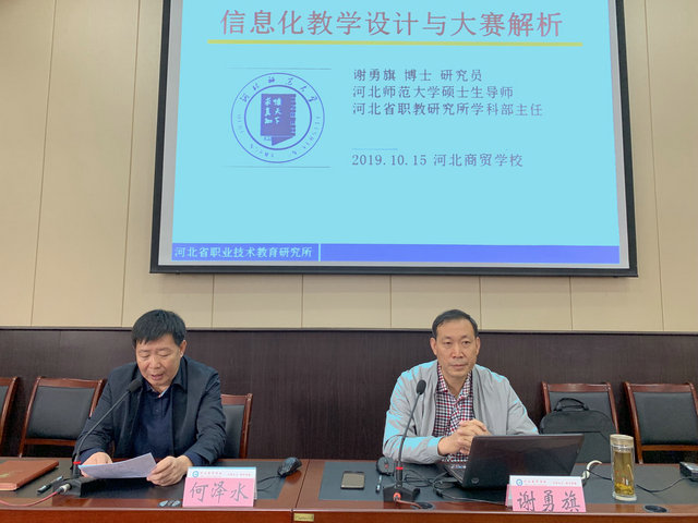 10月15日,我校特邀河北省职业教育研究所学科部主任谢勇旗在报告厅举办了《信息化教学设计与教学能力大赛解析》专题讲座。学校党委副书记何泽水以及全体专兼职教师聆听了本次讲座。这是我校组织的商贸大讲堂系列讲座之一。