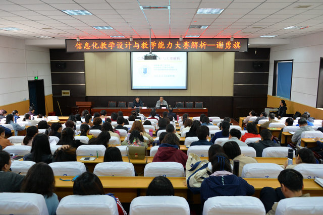 讲座中,谢主任紧紧围绕“如何认识信息化教学设计”、“如何进行信息化教学设计”、“信息化教学能力大赛解析”三个方面进行了深入的解读,通过案例鲜明的对比,理论联系实际,解答了部分教师的疑惑。