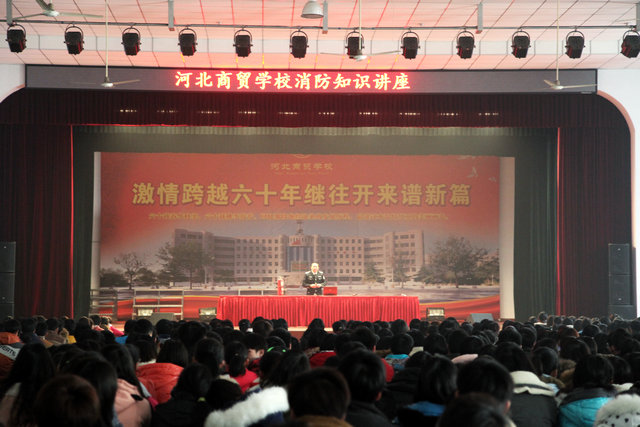 2月25日下午,石家庄市五进消防宣传中心路平教官在我校文体活动中心为在场的2013级900余名学生进行了消防安全知识宣传。